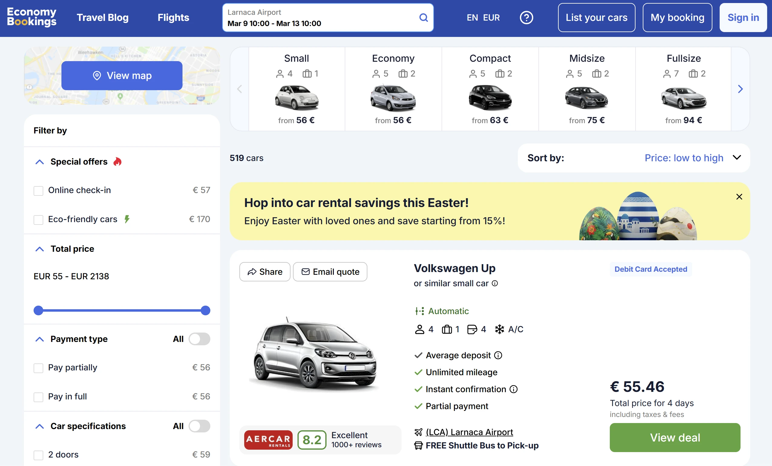 Um günstige Angebote in Larnaka zu finden, nutzen viele Economy Bookings. Dieser Aggregator ist praktisch, wenn Sie schnell Budget-Autos vergleichen und die Ergebnisse nach Getriebe, Versicherung und Preisspanne filtern möchten.