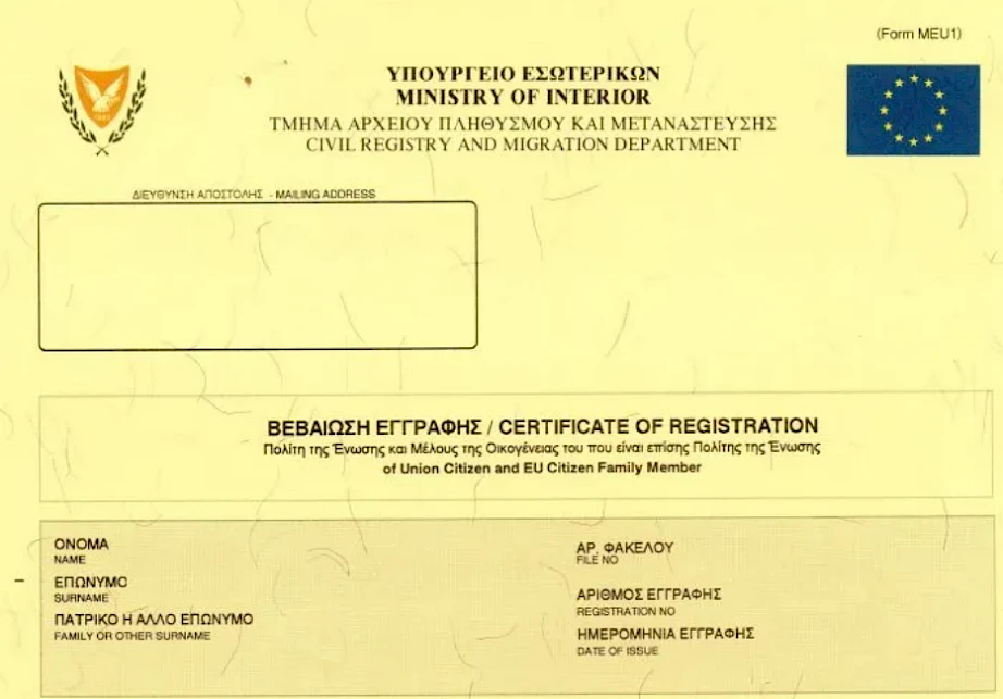 Για τα μέλη της οικογένειας πολίτη της ΕΕ που δεν είναι οι ίδιοι πολίτες της ΕΕ, στην Κυπριακή Δημοκρατία δεν εφαρμόζεται το συνηθισμένο Yellow Slip για πολίτες της ΕΕ, αλλά η διαδικασία MEU2 — Residence Card (Δελτίο Διαμονής) για μέλος οικογένειας πολίτη της ΕΕ. Η αίτηση πρέπει να υποβληθεί το αργότερο 4 μήνες μετά την είσοδο στην Κυπριακή Δημοκρατία. Κατά την υποβολή, ο πολίτης της ΕΕ πρέπει να είναι παρών μαζί με το μέλος της οικογένειας και να επιβεβαιώσει το δικαίωμα διαμονής του στη χώρα. Η Residence Card μέσω MEU2 εκδίδεται συνήθως για 5 έτη, ενώ το ποσό και η διαδικασία πληρωμής του τέλους είναι προτιμότερο να ελέγχονται επιπλέον κατά την ημερομηνία επικοινωνίας με το Migration Department.
