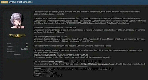 По информации издания Lenta Cyprus, неизвестные хакеры получили несанкционированный доступ к системе Thalis, которая используется почтовой службой для обработки корреспонденции, включая официальную правительственную почту. В опубликованных в тёмной сети архивах якобы содержатся служебные письма между министерствами, внутренние распоряжения, а также технические данные по отслеживанию и регистрации почтовых отправлений.