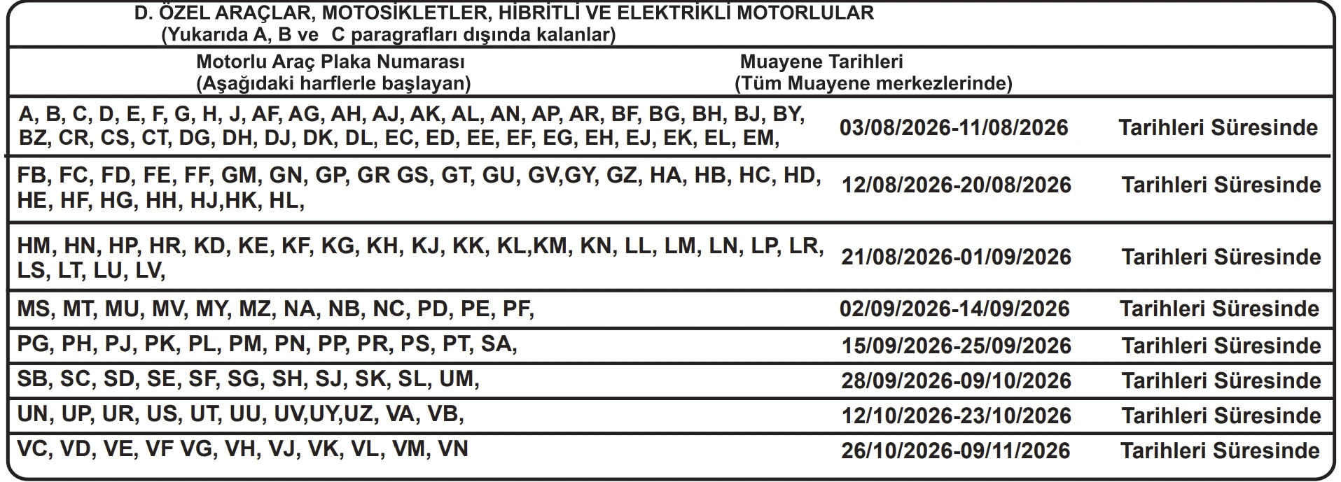 Bazı plakalar için belirli tarihler vardır — genellikle iki haftalık bir süre verilir. Bu tabloda 2025–2026 yılları için belirli plaka serilerinin tarihleri görülebilir. Dikkat edin — genellikle A bölümü kontrol edilir, ancak normal sivil araçlar için D bölümü geçerlidir — bu tarihler aşağıdaki görselde gösterilmiştir.