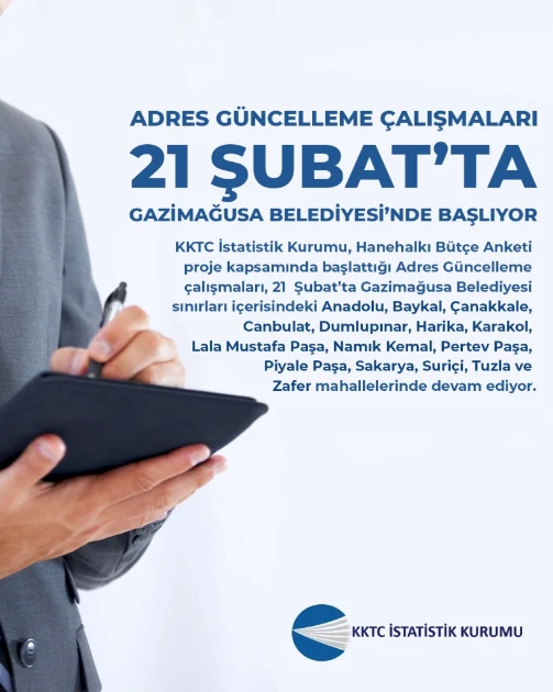 Η Στατιστική Υπηρεσία της ΤΔΒΚ ανακοίνωσε ότι οι εργασίες επικαιροποίησης διευθύνσεων θα συνεχιστούν αύριο εντός των ορίων του Δήμου Αμμοχώστου.