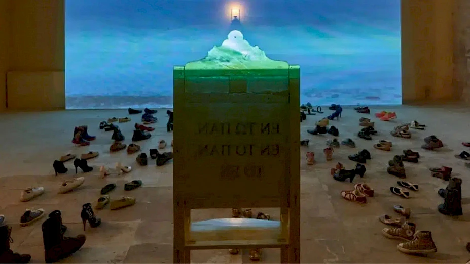 Shoes, boots, and sandals are arranged on the gallery floor as a single path — from everyday city life to a symbolic journey toward the sea. In the background, large projections of waves appear, and in the center, a glowing lantern acts as a beacon for “invisible travelers.” Each pair of shoes marks someone’s life and destiny, collectively forming a visual “archive” of human stories.